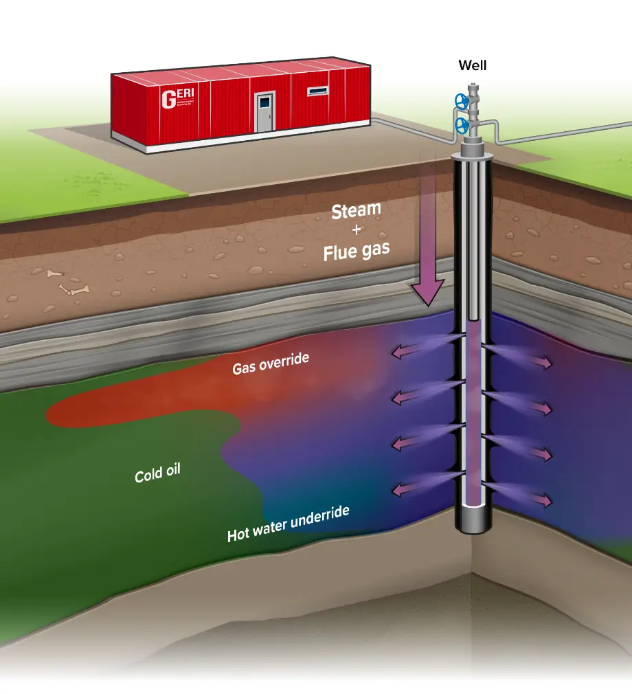 GERI’s co-injector performs an enhanced version of Cyclic Steam Stimulation (CSS), adding heat while also rapidly re-pressurizing the reservoir by co-injecting flue gases.
