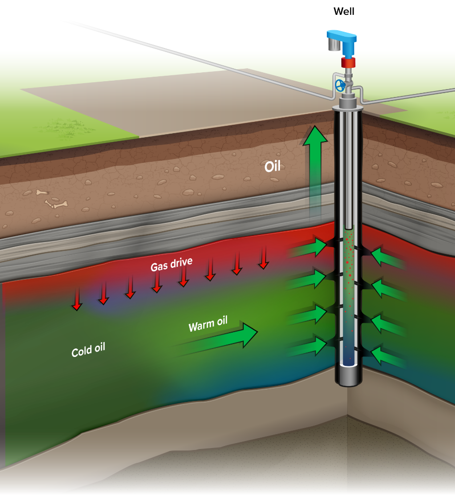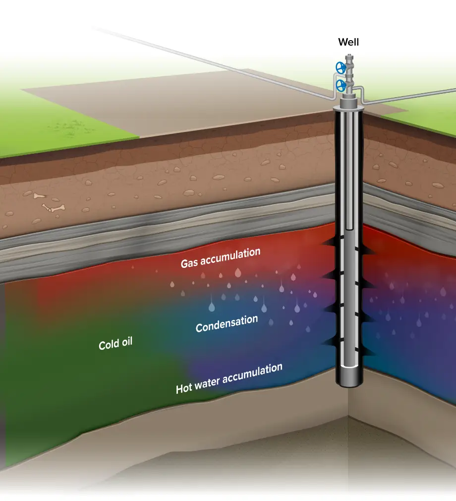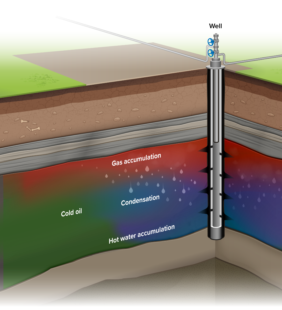 Maximum heat and gas rates are injected into a well and oil is produced from offsetting wells. Optimal sweep efficiency is achieved by steam and gas working together to scour residual oil left behind from primary production. As steam migrates along the top of the reservoir, it condenses further away from the injection well, releasing the heat of condensation, further improving sweep efficiency.